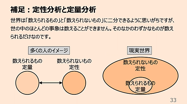 ここで、「なるほど、定性分析も必要だ」と思ったあなたは、もしかして世の中は定量的なものと定性的なものの二項対立だと思っていないだろうか。羽山氏は以下のように提唱する。