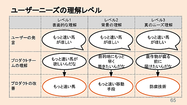 また、本当のニーズを見つけるためには、ほしいものを訊くだけではなく行動の目的を訊くことが大切。質問の掘り下げ方によって、より的確なニーズを掴める。
