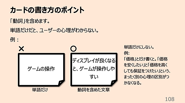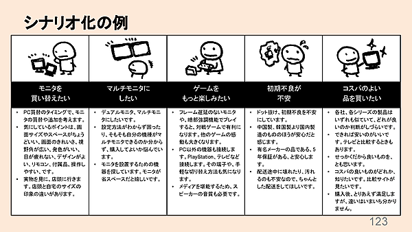 ユーザー心理マップができると全体を俯瞰できるが、複雑で大きなマップはそのままプロジェクトの資料として参照するには不便だ。そこで、心理グループごとのシナリオに書き起こすことがおすすめという。A4で1ページくらいのシートにしておき、プロジェクト中はことあるごとに参照できるようにしておこう。