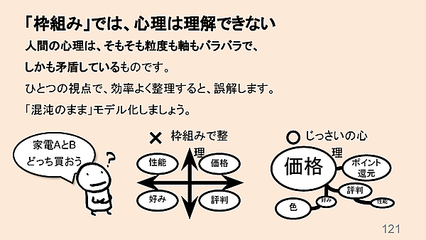 羽山氏は「枠組みはあまりよろしくない」と警告。人の心理は、枠組みでは理解できないものだからだと言う。親和図法の大家である川喜田二郎の著書には、親和図法のワークショップ中にフレームワークで整理をはじめたチームに割って入り、ふせんをバラバラにしてしまったエピソードが紹介されている。「定性分析は、混沌を混沌のままに統合するのがコツ」と羽山氏は語る。