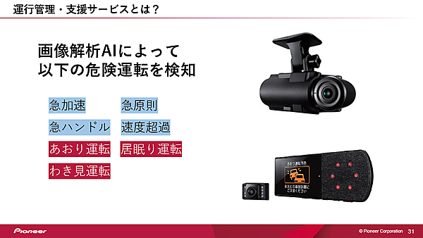 社有の車両は地図上にマッピングされ、運行管理者はドライバーの運行状況を把握し、日報やレポートなどの作成業務を効率化できる。また、ドライブレコーダーのセンサーや画像解析AIによって、急加速や急ハンドル、急減速などの危険運転を検知すると、「急減速を検知しました。安全運転を心がけましょう」というアナウンスが流れ、ドライバーに注意喚起を促し、車両管理者にその情報を連携することで事故の抑制に役立てられている。