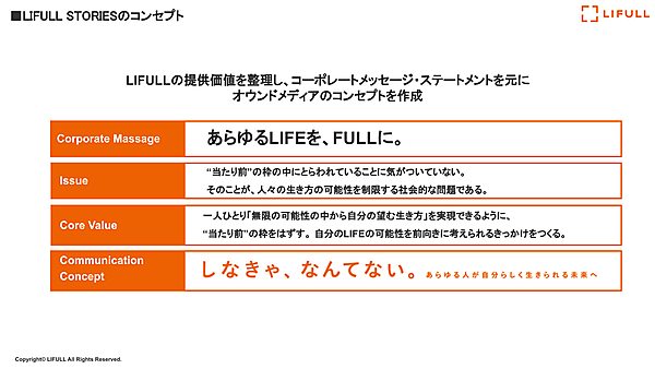 株式会社LIFULLでは、2017年4月の社名変更を機にマスターブランド戦略の推進を開始し、当初は社名認知を高めるために、テレビCMを中心としたコミュニケーションを行った。しかし数十秒のCMだけでは、提供価値を伝えきるのが難しく、継続的に企業姿勢を発信できるコンテンツとしてオウンドメディアに取り組み始めた。それが「LIFULL STORIES」だ。「しなきゃ、なんてない。」をコンセプトに、多様な人のインタビュー記事を掲載している。
