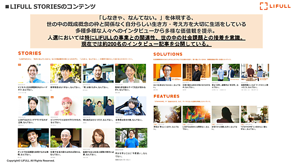 LIFULL(ライフル)が運営するオウンドメディア『LIFULL STORIES』は「あらゆるLIFEを、FULLに。」というコーポレートメッセージを伝えるべく「しなきゃ、なんてない。」というコンセプトで、既成概念にとらわれない生き方への気づきや後押しにつながるコンテンツを発信し続けている。