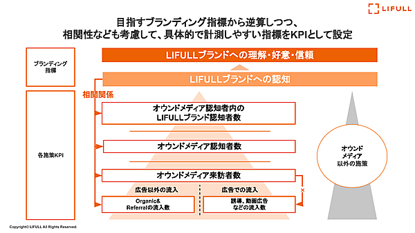 ブランディング活動の指標は「LIFULLというブランドを知っていただき、さらには理解や好意、信頼につなげていく」こと。これは、テレビCMとオウンドメディアの両翼で進めている。オウンドメディアの効果測定はなかなか難しいが、LIFULL STORIESの場合は、ブランディング指標から逆算し、計測しやすい指標をKPIとして設定している。たとえば、来訪者数はアクセス解析で、認知者数はアンケートを取っているとのこと。