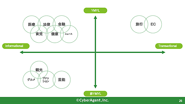 そこで、クエリをInformational / Transactionalか、YMYLかそうでないかの2軸に分けてプロットしてみると次の図のようになる。