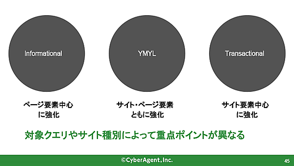YMYLの場合は、ページ要素とサイト要素の両方の強化が必要だ。つまり、これまで説明してきた双方の対策を行うことになる。ただし、InformationalのYMYLでは、大規模サイトを除きTransactionalの対策であるクロールバジェットに合わせた対策は不要だ。