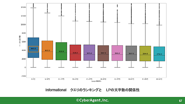 たとえばランキング1−5位のコンテンツを見ると、LP(ランディングページ)の文字数は約4,000文字と最も多くなっており、サイト内にキーワードを含むページも最も多くなっていることがわかった。