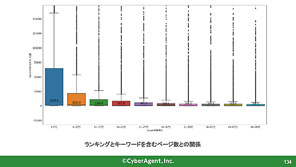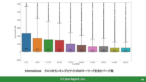 以下の図は、Transactionalクエリの検索表示ランキングと、キーワードを含むページ数との関係を示したものだ。サイト内にキーワードを含むページが多いほど、圧倒的にランキングが上がることがわかる。