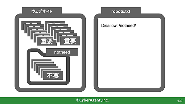 では、重要なページのクロールを確保するために、重要でないページのクロールを減らすにはどうすればよいか。方法の1つとして、重要ではないページは特定のディレクトリ(たとえばnotneed)に格納し、robot.txtでそのディレクトリ全体のクロールをDisallowに指定すればよい。