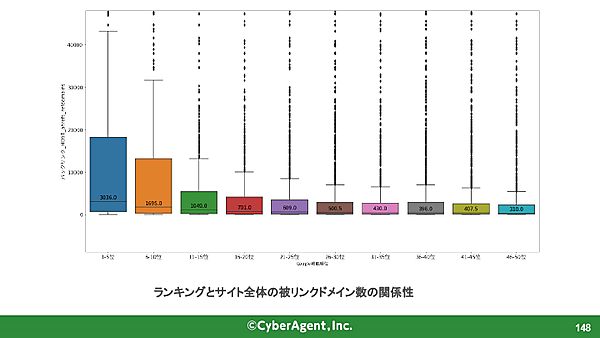 以下のグラフは、検索表示ランキングと被リンクドメイン数の関係を示したものだ。サイト全体に被リンクが集まるとランキングが上がりやすくなることがわかる。同様に、メンションの数、指名検索の数も、ランキングに対して同様の傾向がある。