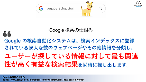 Googleでは、「Google検索の仕組み」というドキュメントを公開しているが、そこには、Google検索は「ユーザーが探している情報に対して最も関連性が高く、有益な検索結果」を探し出すと記述されている。