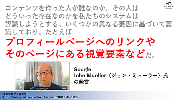Webサイトやコンテンツでも同様であると考えると、ユーザーに伝わりやすくE-A-Tを可視化する必要がある。Google検索チームのJohn氏は「Google検索では、プロフィールページへのリンクやそのページにある視覚要素などを基にコンテンツを作った人が誰なのかを認識しようとしている」と述べたことがある。