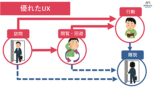 ユーザビリティはいわゆる使い勝手のことで、UX(User eXperience|ユーザーエクスペリエンス)と同義と考えていい。コンバージョンレート(CVR)や遷移率、直帰率など実際のユーザー行動に直結することもある。優れたUXであれば、Webサイト内でのユーザー行動はスムーズになるが、粗悪なUXの場合は即離脱などネガティブな影響を与える可能性がある。