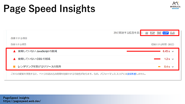 Core Web Vitalsの問題の有無を調査する代表的なツールとして「Page Speed Insight(ページスピードインサイト)」がある。無料ツールで、どこに問題があるか、どのような要素を改善すればいいかをアドバイスしてくれる。