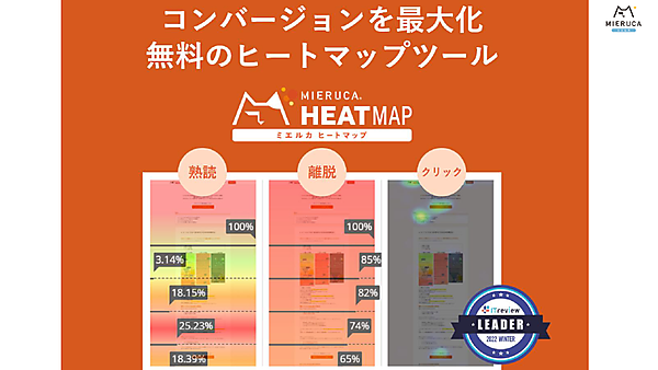 このような、一見定量化しづらいユーザビリティの善し悪しを確認するには、ヒートマップ分析がお勧めだ。ユーザーがページ内でよく見ていたり、多くタップ/クリックしていたりする場所が暖色に、見ていないエリアは寒色に着色され、分析・レポートしてくれるツールである。Faber Companyではミエルカヒートマップを提供している。