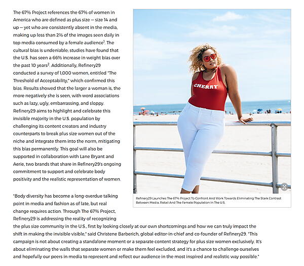 たとえば、Refinery29はデータを利用して、ネット上の画像に見られる特大サイズの女性の割合が適切でないことを示した。同社はこのデータをブランド戦略に取り入れて、米国の実際の女性像を正確に反映した写真の撮影とイラストのデザイン刷新に着手した。