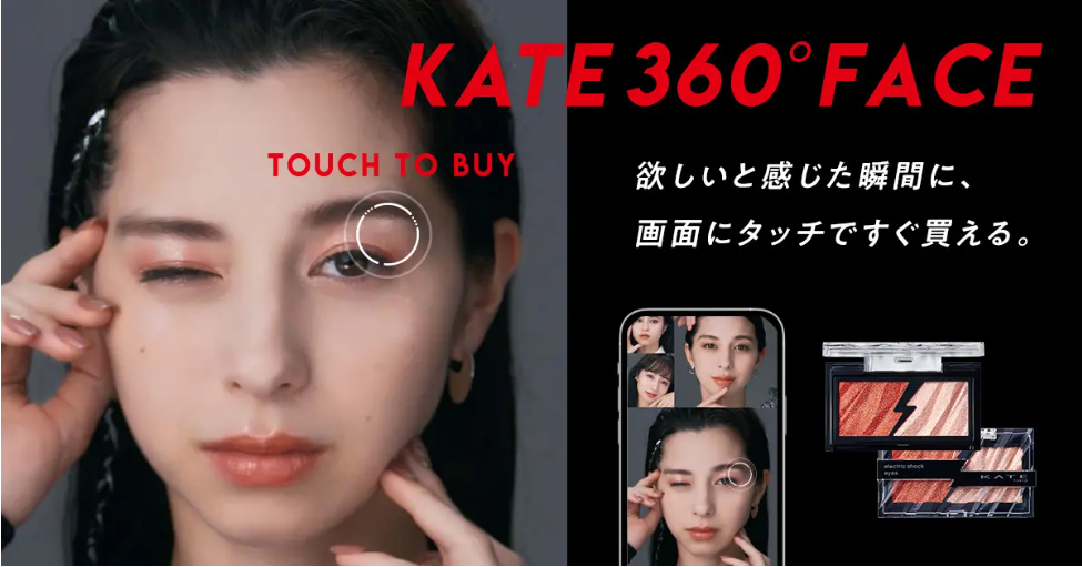 また、「パルス消費」(スマホ操作中に瞬間的にものを買いたくなり、商品を見つけ、購入まで完了させる消費行動)を促進すべく、「KATE 360° FACE」機能を新たに導入した。「KATE 360° FACE」はメイクをリアルに伝えるため、モデルの顔を360度回転させることでさまざまな角度からメイクが見られるようになっている。画面をタッチすると、商品が保存できたり、ECサイトに遷移して商品が購入できたりする。