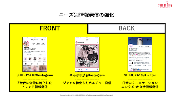 たとえば、「SHIBUYA 109(@109_shibuya)」のInstagramアカウントでは、Z世代全般に向けたトレンド情報を発信している。このアカウントではショッピングセンターに関する投稿はほとんどなく、流行のスイーツやメイク情報を発信しながらユーザーとコミュニケーションをとっている。「やみかわ渋谷(@yamikawa_109)」のInstagramアカウントでは「地雷系」「量産型」など呼ばれるジャンルに特化して発信をしている。フォロワー数は5万人ほどだがエンゲージメント率が高く、1投稿でエンゲージメント率が11%に達することもあるという。