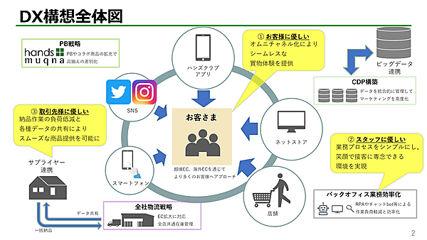 東急ハンズは、企業から商品を仕入れ、それを消費者に販売する小売業だ。取引先、消費者、そして店舗スタッフという、微妙に立場の異なる利害関係者がそれぞれ居る中で、いずれにもDXの恩恵を届けることが重要ではないか……というのが本田氏の考え方。これをまとめたのが以下の図だ。