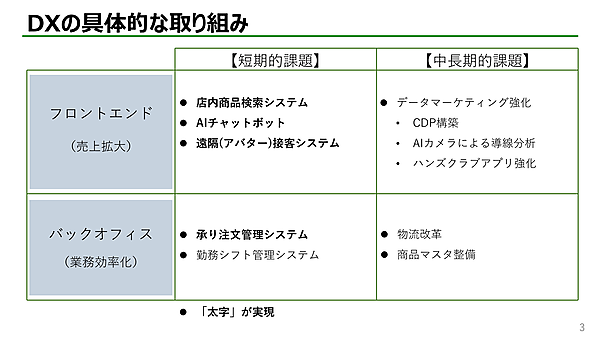 では、具体的にどのような取り組みがすすんでいるのか。本田氏は次の4象限の図を紹介した。お客様向けのフロントエンド(売上拡大)の点と、従業員が関わるバックオフィス(業務効率化)という観点と、短期的に実現できるもの、中長期的に腰を据えて取り組むもので分けていると本田氏は説明した。太字になっているものが実現できているものだ。