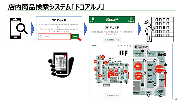 事例として、本田氏はお客様がスマートフォンやパソコンから商品名を検索すると店内のどこにあるかをマップ上で表示してくれるWebサービス「ドコアルノ」を紹介した。「ドコアルノ」は早期実装ができた機能の1つだ。またAIチャットボットを導入し、電話によるお問い合わせ対応時間の削減に繋がったという。