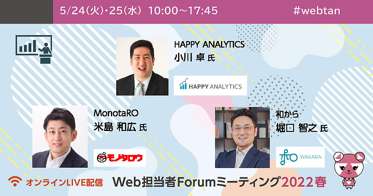 モノタロウ、カインズ、テレビ東京、KATE、ダイキン、第一生命、KDDIなどが登壇する「Web担当者Forum ミーティング 2022 春」を5月24日(火)、5月25日(水)に開催します。