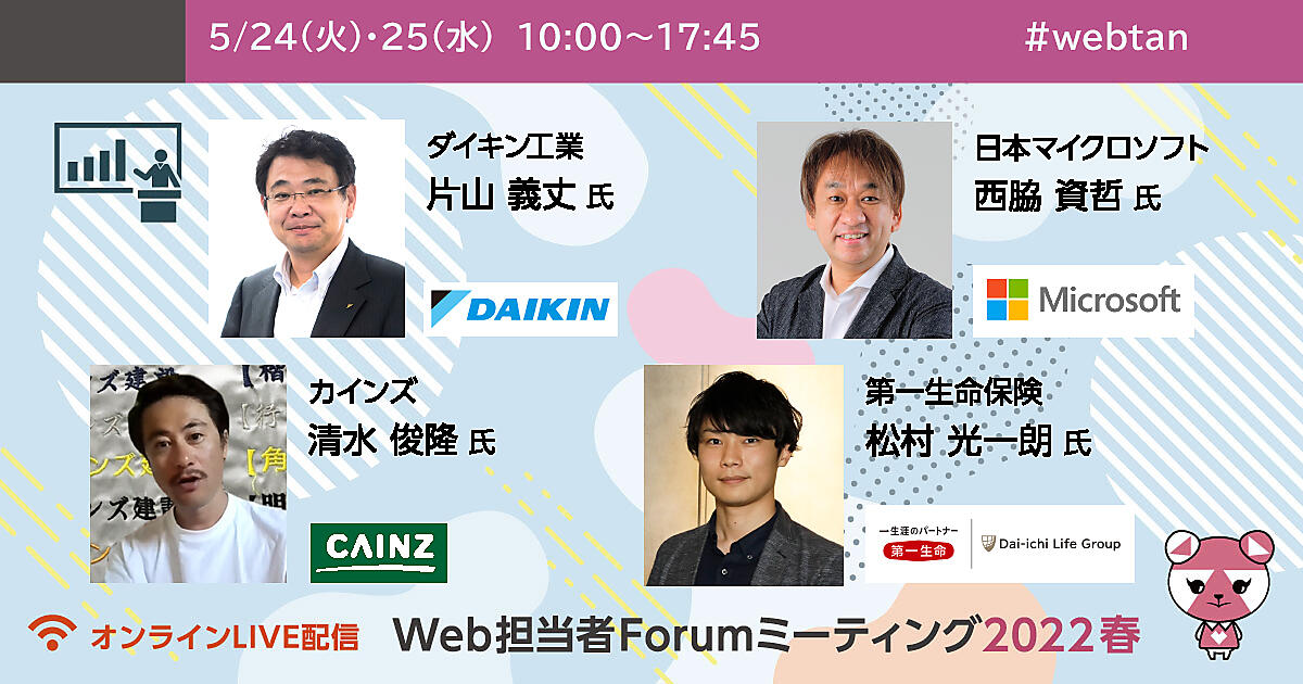 モノタロウ、カインズ、テレビ東京、KATE、ダイキン、第一生命、KDDIなどが登壇する「Web担当者Forum ミーティング 2022 春」を5月24日(火)、5月25日(水)に開催します。