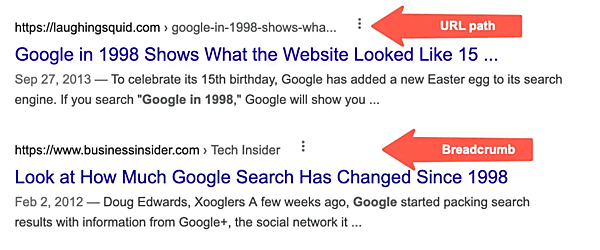 グーグルは近頃、単にページのURLではなく、意味のあるURLパスを表示しようと最善を尽くしている。これは次の要素で構成される: