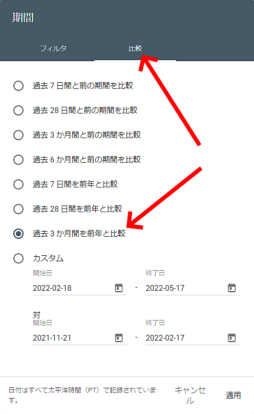 - 「過去3か月間と前の期間を比較」を選択し、ダイアログボックス右下の[適用]をクリック
