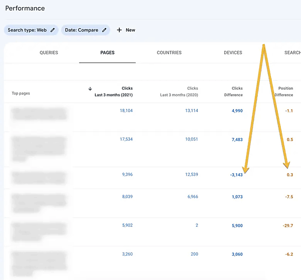 このフィルタを指定した状態で、グラフの下にある表で「ページ」タブや「クエリ」タブをクリックすると、(特に検索順位が大きく変わらなかった場合に)過去1年間でオーガニック検索トラフィックが増減したページまたは検索クエリを確認できる。