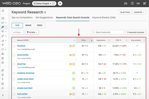 「WebCEO」は、クリック数が減少しているキーワードをより手軽にモニタリングできる。Search ConsoleやGoogleアナリティクスと連携してデータをモニタリングし、クリック数が減少しているクエリがあればメールで通知するなどもできる。