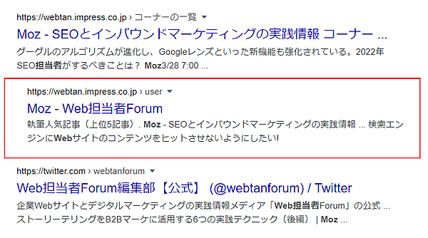 - URL ―― URLのパス(以前は緑色だったが、現在は黒色で、パス部分はパンくずリストとして表示される場合も)