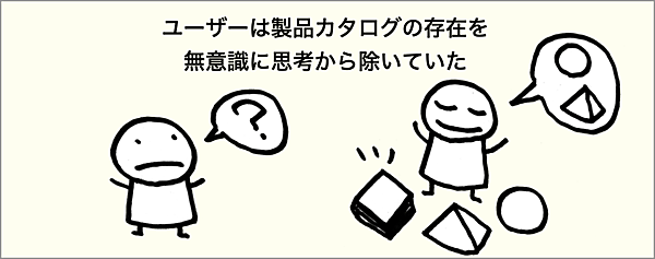 ユーザーが嘘をついていたわけではありません。「業務システムのミーティングだ」と思っていたので「カタログは関係ない」と無意識のうちに思考から除いていたのです。しかし、ユーザーの行動を見てみると、現実のユーザーの世界はもっと広がっていたのです。