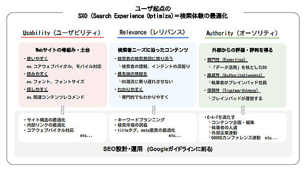 メディアグロースのために意識していることは、ユーザー起点で考えるSXO(Search Experience Optimize、検索体験最適化)だ。Googleガイドラインに従って、Usability(ユーザービリティ)、Relevance(関連性)、Authority(権威)の3つの観点を重視している。検索エンジンアルゴリズムの対策をするというよりも、このフレームワークを使って、常に改善を行っているという。