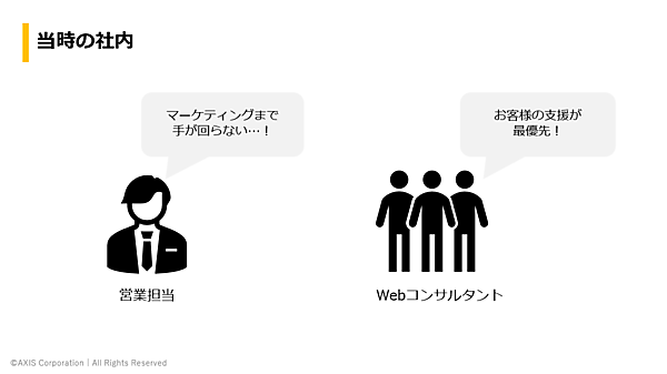 一方で、社内の体制を見てみると、営業スタッフは1名のみ。そのスタッフが営業からマーケティングまで全てを担っていました。当然、目の前の商談をこなすことが精一杯で、数年後のお客様のためにマーケティングをする余裕はとてもありません。