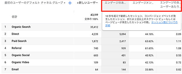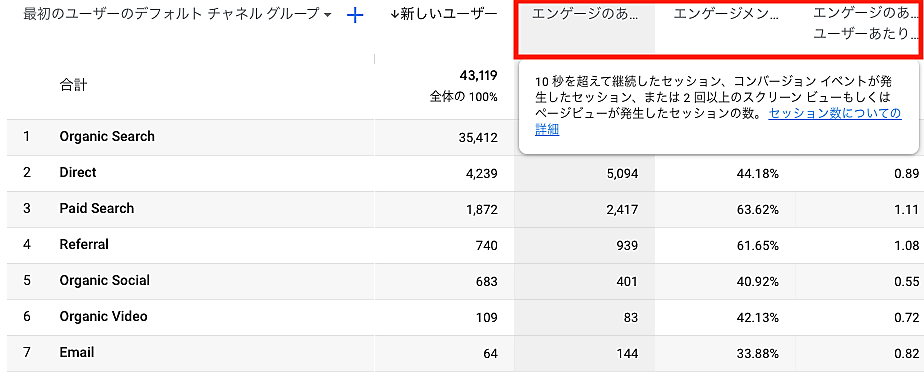 さらにUAの多くのレポートで出てきていた「直帰率」という指標がなくなり、「エンゲージメント(率)」という新指標が登場しています。