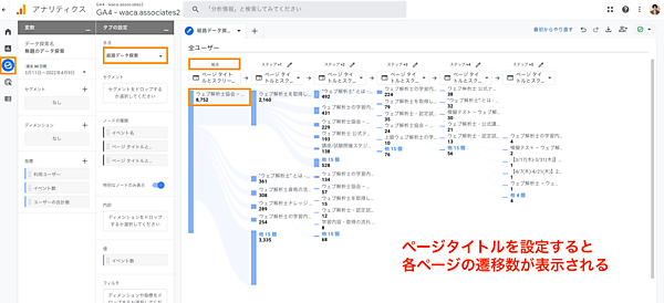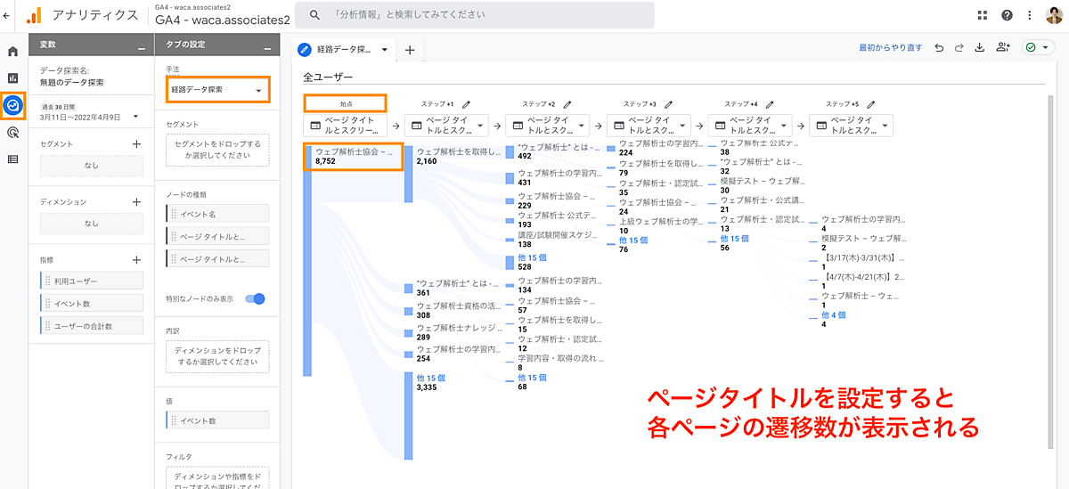 ここで、動線分析に使える[経路データ探索]を見てみましょう。「始点」という始まりのページを選ぶと、そこから各ページにどのくらいの数が遷移しているかを見ていくことができます。これは意図したページに遷移してくれているかを検証することに活用できます。また「終点」という最後のページから遡ってユーザーの動線確認もできます。これはコンバージョンに至るまでのコンテンツの分析に役立ちます。
