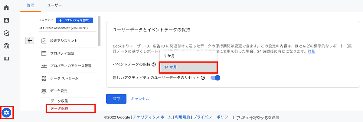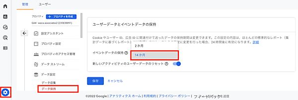 管理画面で「イベントデータの保持」の期間を「2か月」から「14か月」に変更しましょう。
