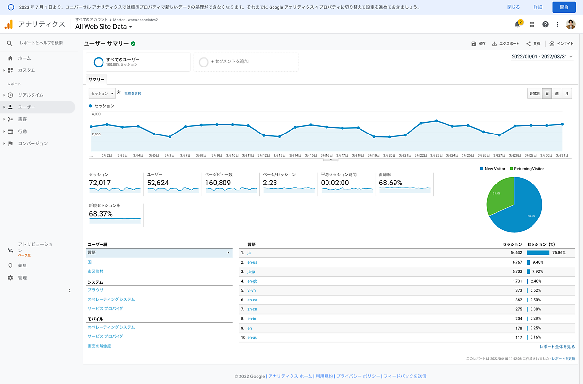 今年3月16日に、Googleアナリティクスのユニバーサルアナリティクス(UA)のサポート終了が正式に発表されました。「2023年7月1日からは新しいデータ処理はできなくなる」という内容です。