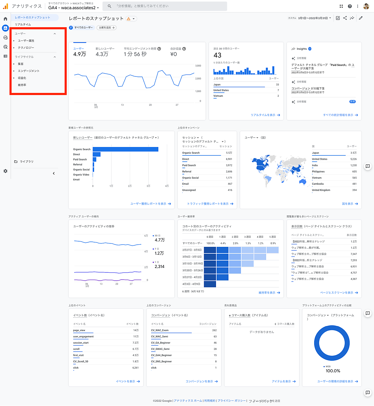 UAに慣れ親しんだ方は戸惑うかもしれませんが、これまであった項目がなくなったり統合されたりして、[ライフサイクル]という名称になり、[集客][エンゲージメント][収益化][維持率]という区分になっています。新しい[ライフサイクル]のメニューでは、その言葉どおり、ユーザーがサイトに訪れてからリピートするまでの一連の行動サイクルがわかるようになりました。