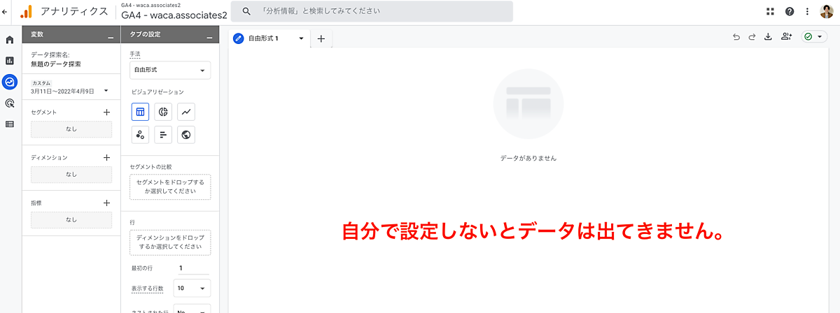 ただし、[探索]メニューをクリックするだけでは何もデータは表示されません。GA4では「何を分析したいのか?」をあらかじめ定めておかないと活用できないのです。