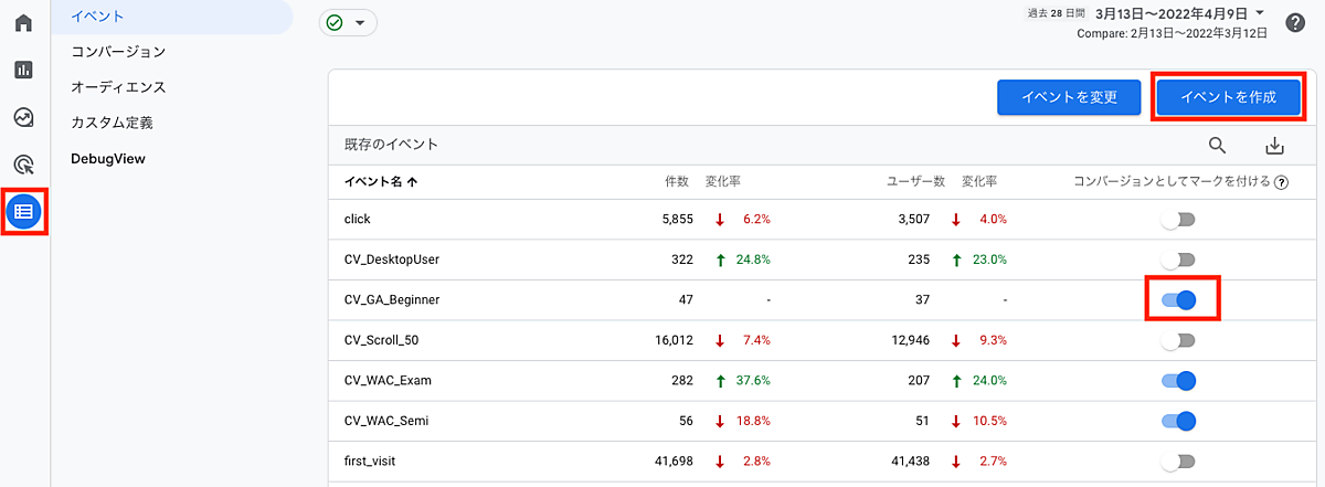 GA4ではイベント作成後にコンバージョンとして設定する必要がありますので必ず行いましょう。