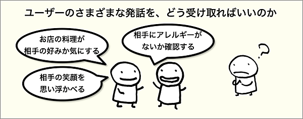 ユーザーの発話を「そのまま」信じてはいけない、という原則のポイントは、ユーザーの発話の「そのまま」でなければ信じられる、ということです。ユーザーの発話を聞くな、という意味ではなありません。