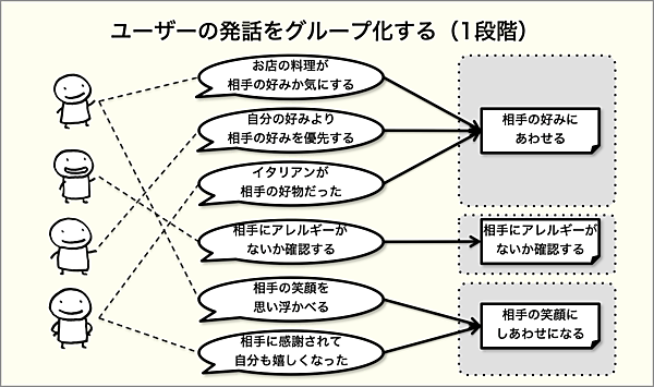 そのためには、ユーザーの発言を「抽象化」という作業をとおして、本質的なニーズへと掘り下げていきます。具体的には、それぞれの発話の背景にある心理に注目して、それぞれの言葉をグループ化し、グループ名をつけていきます。グループ名は、その中身をできるだけうまく表現している文章をえらびます。
