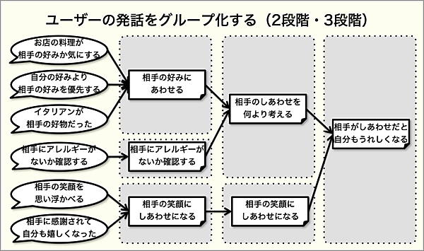 抽象化する前の発話をぼんやりと眺めて、たとえば「イタリアンが相手の好物だった」という発話だけを取りあげ、イタリアンだけを前面に押し出したグルメアプリをつくったとしたら、それはとても部分的なニーズにしか応えていないことに、今ならわかると思います。「イタリアンが相手の好物だった」というエピソードは「相手がしあわせだと自分もうれしくなる」という、根源的なニーズのひとつの表出にすぎないのです。
