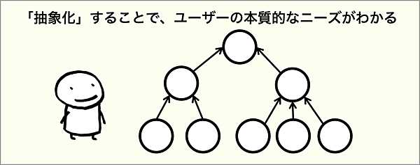 「ユーザーの発話をそのまま信じてはいけない」ことを、もう少し具体的に言うと「ユーザーの発言を抽象化せずに、そのまま受け取ると、それは表面的なニーズであるかもしれない」ということです。抽象化というプロセスをふむことで、信じるべき真のニーズにたどりつくことができるのです。