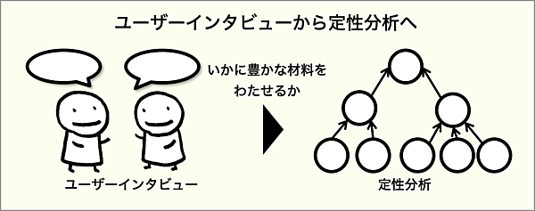 ユーザーインタビューは、狭い意味では、次の「定性分析」ステップの「材料を集める」行為です。次のステップへ、いかに豊かな材料をわたせるか、がインタビューの成果であって、なにかを発見することが主目的ではないのです。