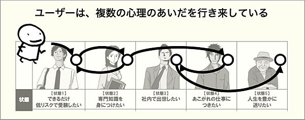 先に「ユーザーのモチベーションは5つの心理が混ざりあってできている」と述べました。ユーザーの心理は、どれかひとつだけ、ということはありません。ひとりの人間の中で複数の心理がせめぎあっています。
