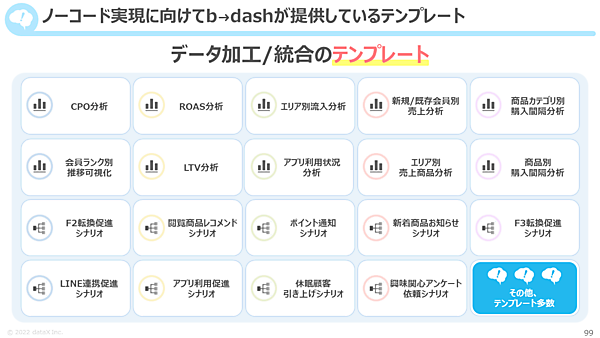 ノーコードというのも大きな特長だ。b→dashのCDPはSQL言語などでプログラムを書く必要はなく、ただ画面上のボタンをクリックしていくだけでデータが準備できる。よく使う分析や施策シナリオはテンプレートとして用意されているため、知識やスキルがなくともやりたいことを実現できる。「ナビゲーションも出るため、バイトの人でも作業できる」と宮川氏は説明する。