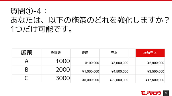- Bの施策:登録数2,000人で、費用は100万円、売上は450万円(増加:350万円)